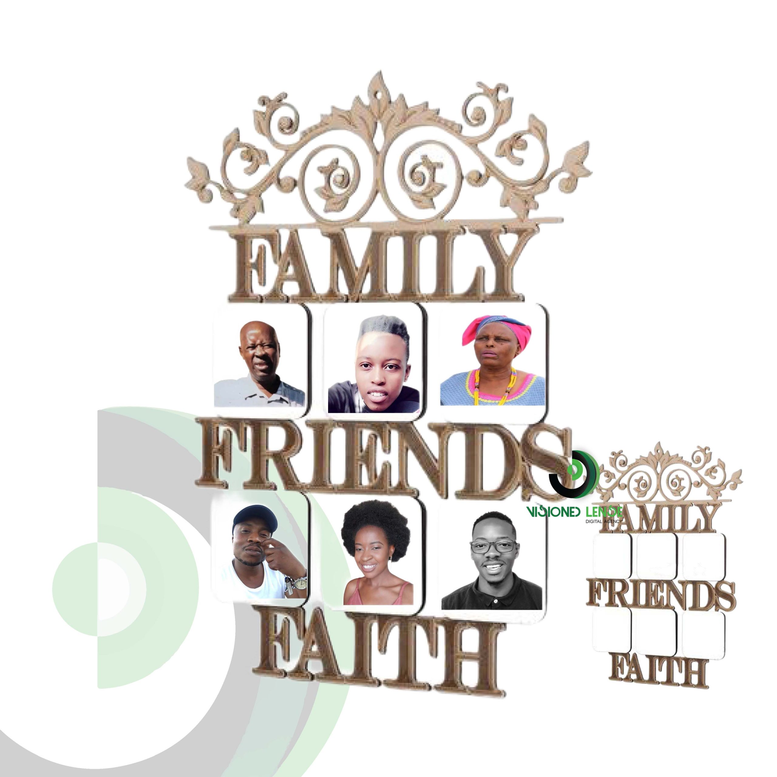 Celebrate the important moments in your life with our custom American MDF photoframe, beautifully laser-cut with the words “Friends, Family, Faith.” This unique frame allows you to showcase a total of 6 cherished pictures, making it a heartfelt addition to your home decor or a thoughtful gift for loved ones.