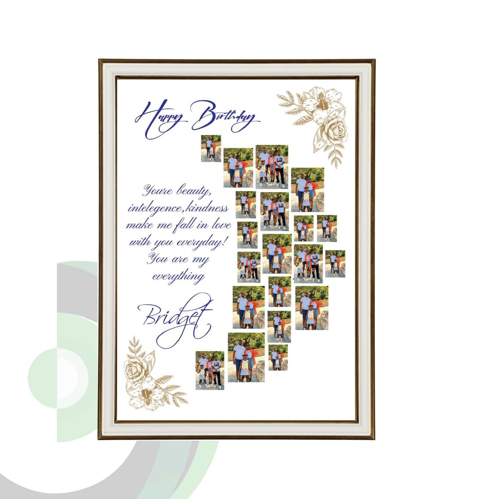 Celebrate life’s special moments with our custom personalized photo frame, designed to showcase 20 of your favorite photos arranged in a beautiful half-moon shape. Complete with a heartfelt message, a bold “HAPPY BIRTHDAY” at the top, and the recipient’s name at the bottom, this frame is the perfect gift to make any birthday unforgettable.